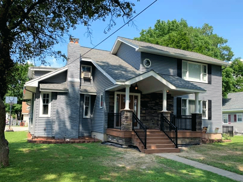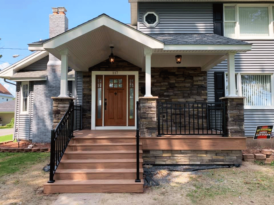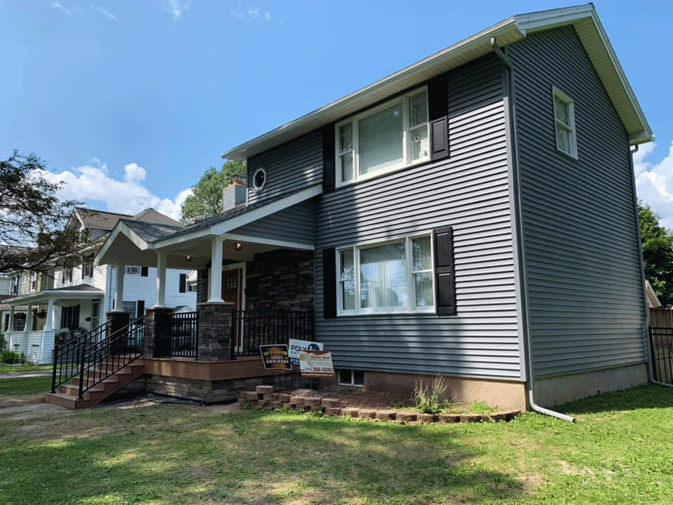 The Gutter Tech crew has been out in Rome, NY this summer along with dozens of other locations all across Central New York and beyond! We’re having a blast working with folks to bring their house closer to dream home status! With this project we worked alongside our sister company Poly Enterprises to reside the entire home, install a new front entrance door and a patio slider door, and built a custom deck and front porch. The Monogram siding, Versetta stone, and new porch and doors bring a custom touch to the home and improve not only the look of the home but the unbeatable comfort of a good deck on a sunny summer day.